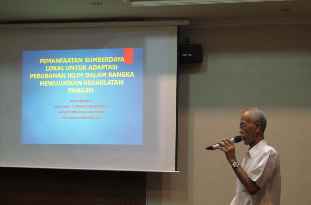 Adalah Bapak Joko Priyono (Peneliti Konsorsium PETUAH Universitas Mataram) berbagi pengalaman dan pengetahuan mengenai pemanfaatan sumber daya local untuk adaptasi perubahan iklim dalam rangka mewujudkan kedaulatan pangan, mengangkat pengalaman dari apa yang dilakukan oleh Konsorsium PETUAH. Konsep ketahanan pangan yang muncul pada era kabinet kerja Jokowi adalah terpenuhinya kebutuhan pangan nasional yang berasal dari produksi dalam negeri yang bermuara pada kemandirian pangan sehingga tidak terpengaruh pada kondisi luar.