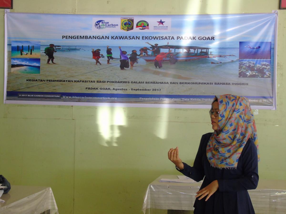 Sejak ditetapkannya Desa Padak Goar sebagai lokasi pengembangan ekowisata yang berbasis masyarakat dengan mengedepankan pengelolaan wilayah pesisir yang rendah emisi, secara otomatis masuk ke dalam lingkup kerja Blue  Carbon Consortium (BCC).  Melalui  program Green Knowledge yang didanai oleh Millennium Challenge Account (MCAI) Indonesia, BCC mulai melakukan aktivitas di daerah tersebut. Terpilihnya Desa Padak Goar sebagai lokasi dampingan program didasari dari potensi alam yang dimiliki dan menjadikan hal ini sebagai tantangan dalam mengelola wilayah pesisir melalui sentuhan pariwisata dengan mengedepankan peranan dari masyarakat itu sendiri. Jawaban dari tantangan tersebut terletak pada Sumber Daya Alam (SDA) dan Sumber Daya Manusia (SDM) yang dimiliki. SDA dan SDM pada suatu daerah adalah saling berkaitan satu sama lain. Bagaimanapun potensi SDA yang dimiliki suatu daerah akan sia-sia jika tidak dikelola dan dimanfaatkan dengan baik oleh masyarakat setempat. Ini lah alasan mengapa SDM suatu daerah sangat penting untuk diperhatikan dan ditingkatkan, lebih-lebih daerah tersebut memiliki potensi alam yang menjanjikan, karena SDM lah yang menjadi penentu mutu produk baik barang maupun jasa yang disuguhkan dalam dunia pariwisata. Artinya, peningkatan kualitas SDM menjadi salah satu kunci untuk meninggikan sebuah nama destinasi wisata di antara sederet destinasi yang kian semakin kompetitif dalam dunia internasional. Berkomunikasi dan berbahasa adalah salah satu keterampilan yang wajib dimiliki oleh masyarakat dalam persaingan dunia pariwisata internasional.