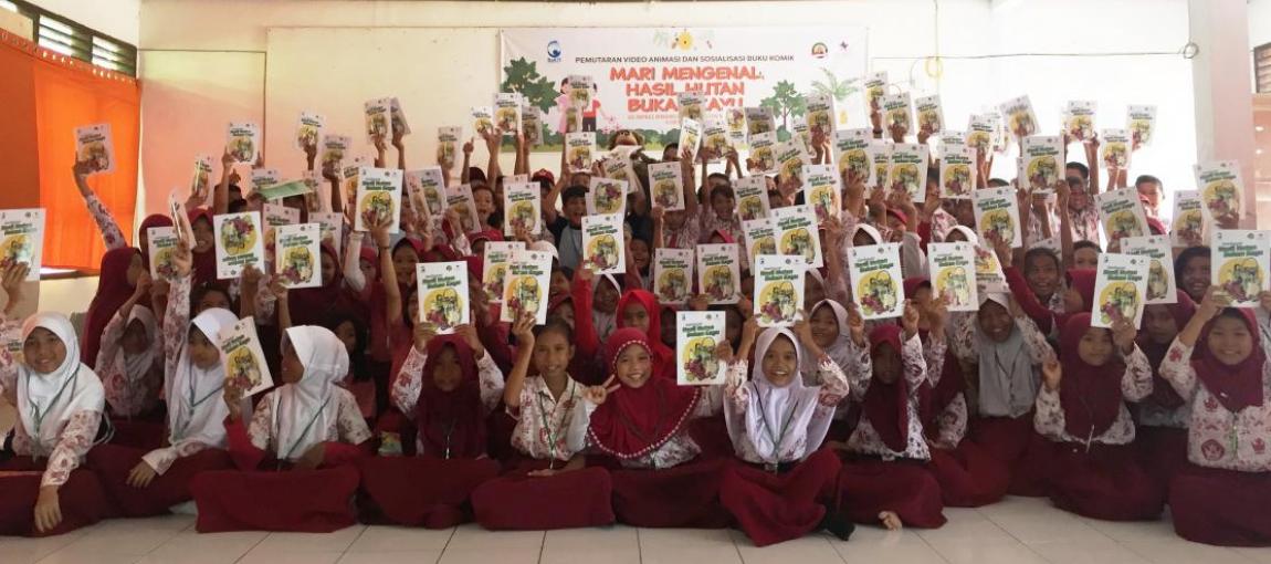 Gemuruh suara anak-anak kembali terdengar. Seratus anak bernyanyi sembari bertepuk tangan mengikuti nyanyian Kak Heru. Mereka tak sabar ingin segera membaca buku komik Mari Mengenal Hasil Hutan Bukan Kayu. Setiap anak mendapatkan satu buku komik. Sebelum membaca, mereka dibagi ke dalam lima kelompok. Setiap kelompok berisi dua puluh anak dari sekolah yang berbeda. Kelima kelompok ini duduk melingkar. Mereka asyik mendiskusikan nama kelompok. Ada yang memilih nama Kemiri, Daging, Kayu Pelet, Madu dan Aren.