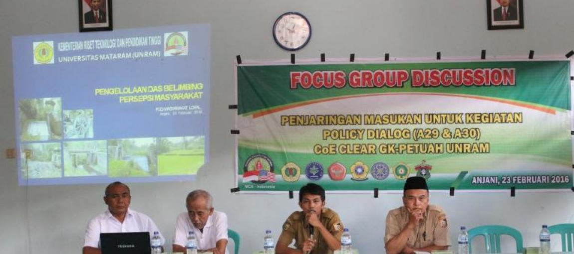 Kondisi tersebut disampaikan oleh Kepala Desa Anjani, Bapak H. M.Zulkarnain saat membuka Focus Group Discussion (FGD) Penjaringan Masukan Untuk Kegiatan Policy Dialog di Daerah Ailiran Sungai Belimbing Kabupaten Lombok Timur yang berlokasi di Aula Kantor Desa Anjani Kecamatan Suralaga Kabupaten Lombok Timur pada tanggal 23 Februari 2016. Diskusi ini dihadiri oleh perwakilan masyarakat DAS Belimbing, seperti PPL, pekasih (juru air desa) dan perwakilan perempuan (kelompok Wanita Tani). Tujuan dari FGD ini adalah untuk menghimpun berbagai informasi terkait dengan permasalahan, kebijakan pemerintah ataupun awig-awig yang sudah ada serta berbagai rumusan gagasan dari masyarakat untuk menjaga ketersediaan dan keberlangsungan sumber mata air baik di daerah hulu, tengah dan hilir. Berbagai informasi ini menjadi bahan penyusunan policy paper, tentunya akan melalui berbagai studi lanjutan dan diskusi. Untuk selanjutnya policy paper tersebut akan diserahkan kepada pemerintah daerah baik Kabupaten ataupun pemerintah provinsi sebagai dasar perencanaan pembangunan berkelanjutan.