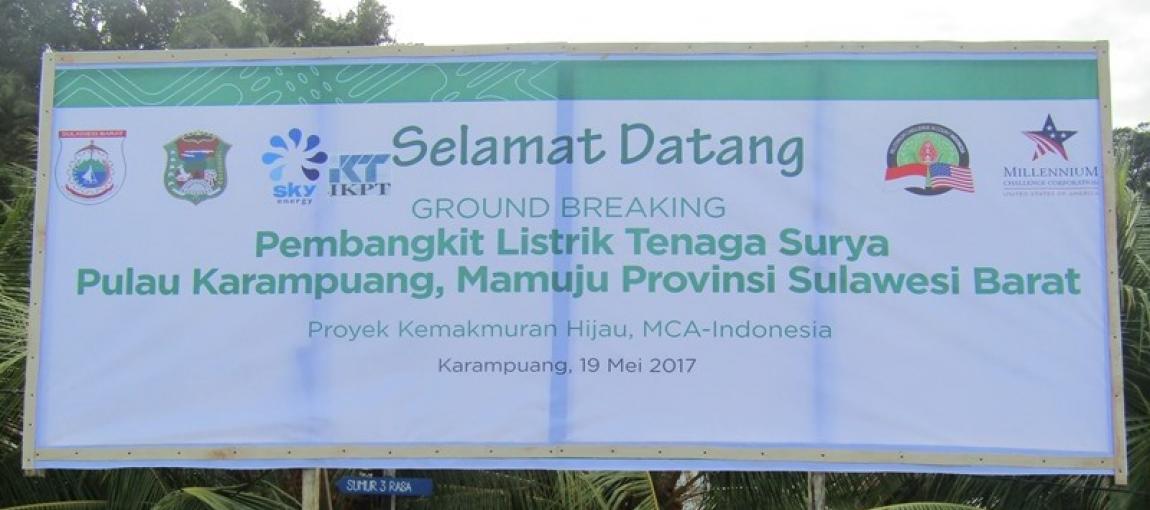 Tiga bulan yang lalu, tepatnya pada tanggal 10 Februari 2017 telah ditandatanganinya perjanjian hibah untuk proyek Kemakmuran Hijau Pembangkit Listrik untuk Pulau Karampuang antar MCA-Indonesia dan Konsorsium PT. SKY Energy Indonesia dan PT. IKPT (Inti Karya Persada Teknik) yang kemudian dilanjutkan dengan berbagai kegiatan fisik di lapangan. Sebagai tindak lanjut, hari ini digelar kegiatan Ground Breking untuk PLTYS yang bertempat di Aula Desa Karampuang. Gubernur Sulawesi Barat dan Bupati Mamuju beserta jajarannya turut hadir, demikian pula OPD baik dari Kabupten Mamuju maupun dari Provinsi Sulawesi Barat, perwakilan MCA-Indonesia, pelaksana hibah dan tentunya yang paling spesial masyarakat Pulau Karampuang.