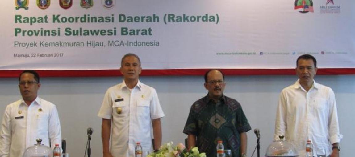Pemerintah Provinsi Sulawesi Barat pada tanggal 22 Februari 2017 telah melaksanakan Rapat Koordinasi Daerah (Rakorda) Tingkat Provinsi bertempat di Hotel D’Maleo Mamuju. Rakorda ini bertujuan bertujuan untuk mengetahui sejauh mana perkembangan proyek yang dilaksanakan oleh para penerima hibah Proyek Kemakmuran Hijau Millennium Challenge Account-Indonesia (MCA-I). Selain itu Rakorda juga bertujuan untuk membangun koordinasi yang baik antar pemerintah daerah di level provinsi maupun di kabupaten, agar dalam pelaksanaan proyek dapat berjalan dengan lancar tanpa hambatan yang berarti.