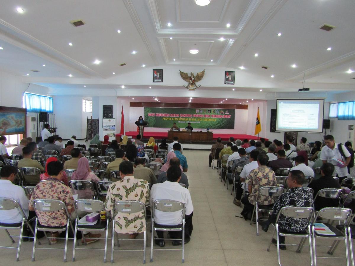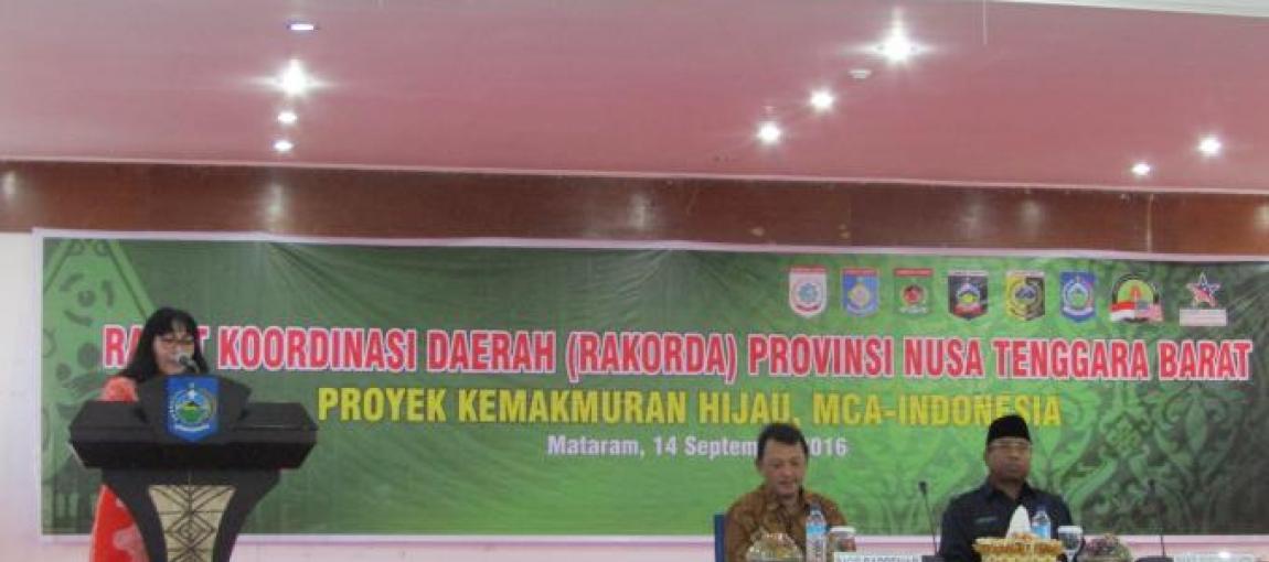 Untuk itu, dipandang penting untuk melakukan sinergi dan sinkronisasi program antara Pemerintah Daerah NTB dengan grantee untuk bersama membangun masyarakat dan lingkungan yang lebih baik. Dengan dasar pemikiran tersebut maka MCA-Indonesia menginisiasi pelaksanaan Rapat Koordinasi Daerah Provinsi NTB Proyek Kemakmuran Hijau pada tanggal 14 September 2016 bertempat di Aula Graha Bhakti Kantor Gubernur Nusa Tenggara Barat. Rakorda ini dibuka oleh Wakil Gubernur NTB, H.M. Amin. Dalam sambutannya, Wakil Gubernur menitikberatkan pada pentingnya koordinasi dan sinkronisasi program grantee dengan pemerintah daerah terlebih lagi saat terjadi pengurangan anggaran pembangunan oleh pemerintah pusat seperti saat ini. Kegitan ini dihadiri oleh SKPD terkait seperti Dinas ESDM, Dinas Kehutanan, Dinas Perkebunan, Dinas Pengelolaan Sumber Daya Air, Dinas Kelautan dan Wilayah Pesisir , Dinas Pertanian Tanaman Pangan dan Hortikultura, Badan Lingkungan Hidup Daerah, Badan Perencana Pembangunan Daerah, PLN Wilayah Nusa Tenggara Barat, Balai Besar Wilayah Sungai (BBWS) dan Balai Pusat Daerah Aliran Sungai (BPDAS) di tingkat provinsi dan kabupaten lokasi kerja MCA-Indonesia (Kabupaten Lombok Timur, Lombok Tengah, Lombok Utara, Lombok Barat dan Sumba Barat) serta seluruh grantee dan jajaran MCAI dan Relationship Manager se-Indonesia.