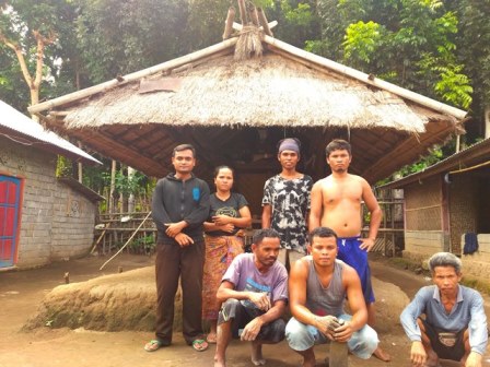 Beberapa pria penduduk lokal, berkumpul bersama-sama untuk saling membantu membangun reaktor biogas masing-masing, bersantai sejenak di berugak. Ada yang mengunyah pinang, yang membuat bibirnya berwarna kemerahan.