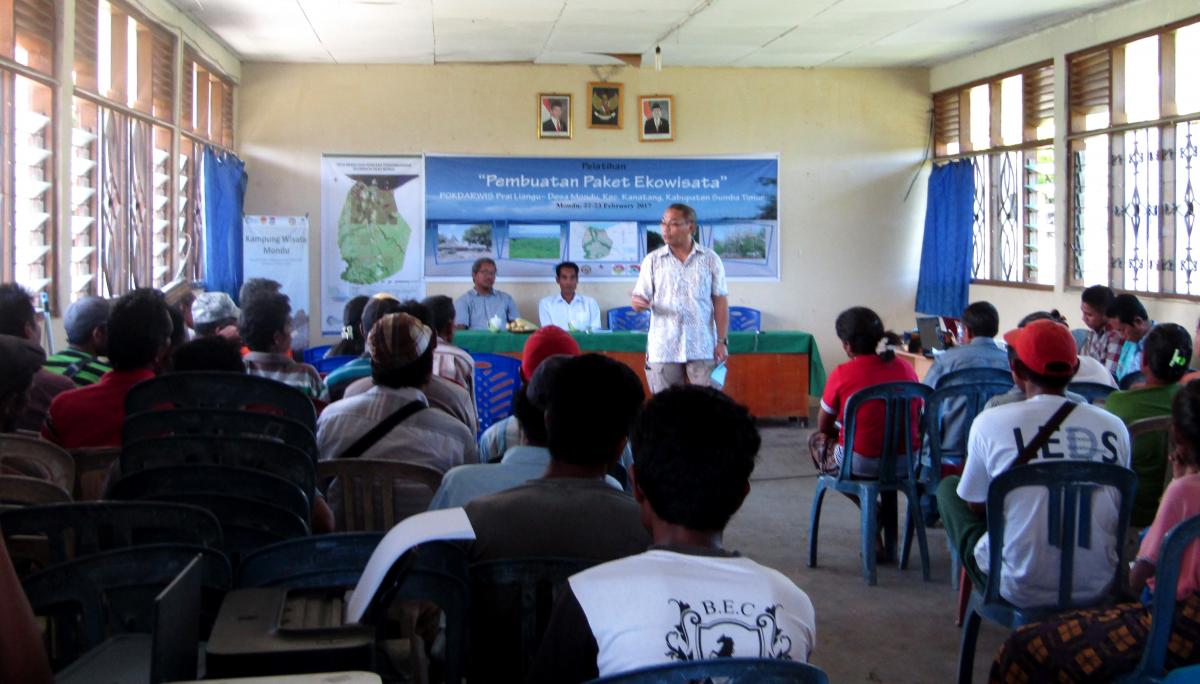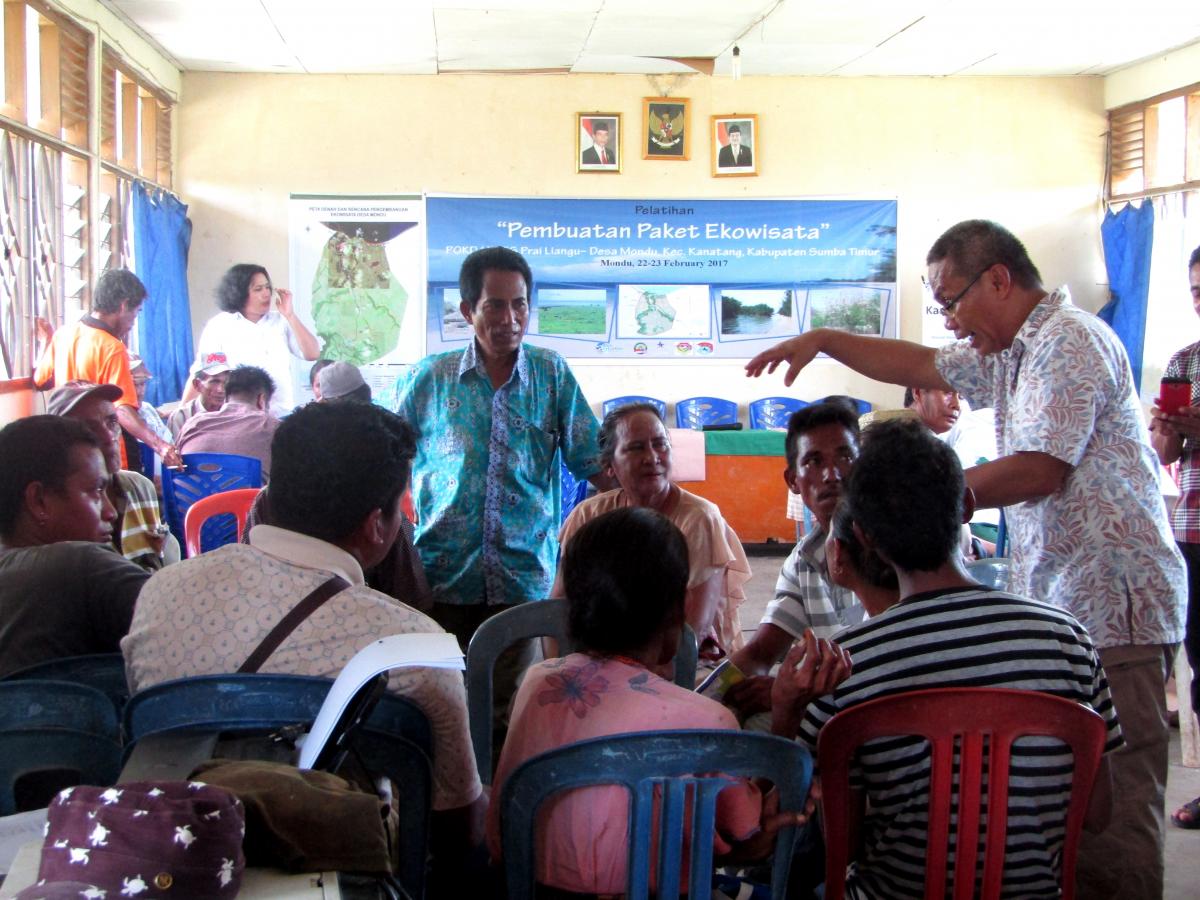 Sebagai lanjutan dari kegiatan peningkatan kapasitas Pokdarwis, BCC pada tanggal 22-23 Februari 2017 kembali melakukan kegiatan Pelatihan “Pembuatan Paket Ekowisata POKDARWIS Prai Liangu - Desa Mondu, Kec. Kanatang, Kab. Sumba Timur” di Aula Kantor Desa Mondu, yang diikuti oleh sekitar 45 peserta dari unsur Pokdarwis, aparat desa dan tim BCC sendiri.  Kegiatan yang difasilitasi oleh Bapak Sonny Rozali dari YAPEKA selama dua hari ini diisi dengan pemberian materi tentang mengenal ekowisata dan prinsip ekowisata, latihan membuat paket ekowisata yang baik serta ada simulasi identifikasi potensi ekowisata di Desa Mondu dan atraksi yang dapat dikembangkan.