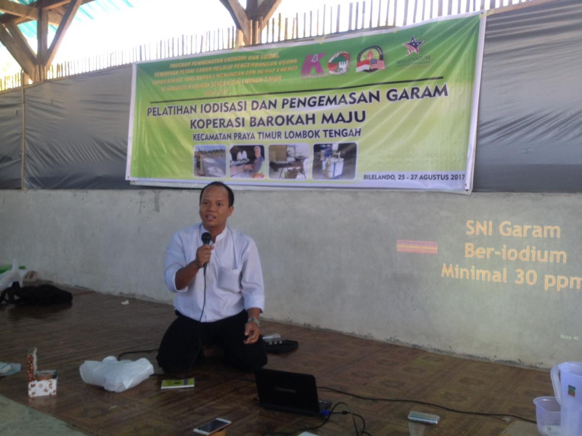 Pada pelatihan tersebut, baik pengurus maupun petani garam mendapatkan pengetahuan tentang perbandingan garam dengan KIO3 (Kalium Iodat) untuk selanjutnya di fortifokasi. Baik menggunakan mesin ( bagi pengurus koperasi) ataupun dengan cara manual (bagi produsen garam rakyat). “eakt doang, te bani ndek. Laun tepolisiangt” (pasti kami lakukan iodisasi, gak berani nanti kami ditangkap polisi),ungkap salah satu peserta seraya menunjuk ke layar yang sedang menampilkan Standar Nasional Indonesia (SNI) No. 01–3556 tahun 1994 dan Kepmen No. 77/1995 garam yang digunakan harus mengandung yodium sebesar 30 – 80 ppm dan Kepres No. 69 Tahun 1994 tentang garam beryodium. Iodisasi pada garam penting dilakukan untuk meningkatkan zat gizi yang dibutuhkan penduduk dalam jumlah yang cukup. Peningkatan zat gizi dilakukan dengan penambahan kalium iodida (KI) atau kalium iodat (KIO3) ke dalam garam dengan komposisi 40-80 ppm. Kalium iodat (KIO3) lebih sering digunakan dalam proses iodisasi karena sifatnya yang lebih stabil dalam garam murni pada penyerapan dan kondisi lingkungan yang baik, dan tidak menyebabkan perubahan warna dan rasa garam