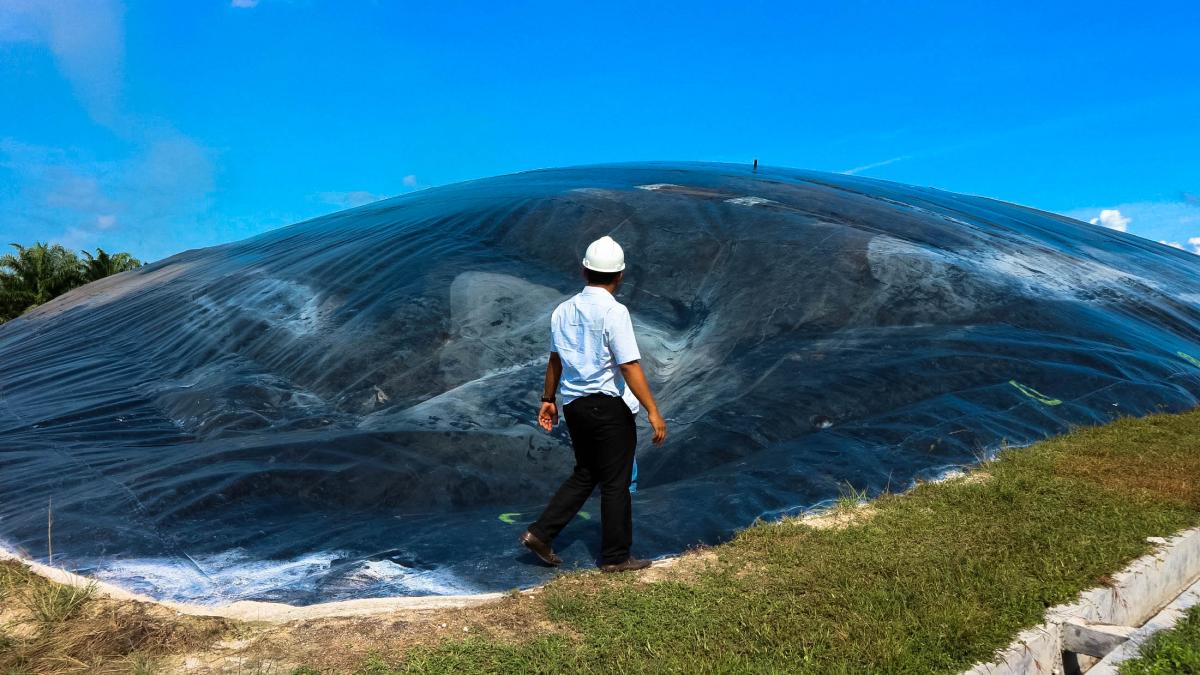 That building does look striking. It situates between the palm trees on an almost two hectares land area. A black object soars resembling a hill on the back of the trees. That black object is approximately 10 meters in height from the ground with a 80 m x 90 m width in a shape of a trapezoid. Additionally, it is evident that an object with a size capacity of 39,000 m3 will attract some public attention. This building is a reactor or a biogas power plant (pembangkit listrik tenaga biogas) or PLTBg of Rantau Sakti, which is located in the village of Rantau Sakti, North Tambusai Sub-District, Rokan Hulu District of the Riau Province.