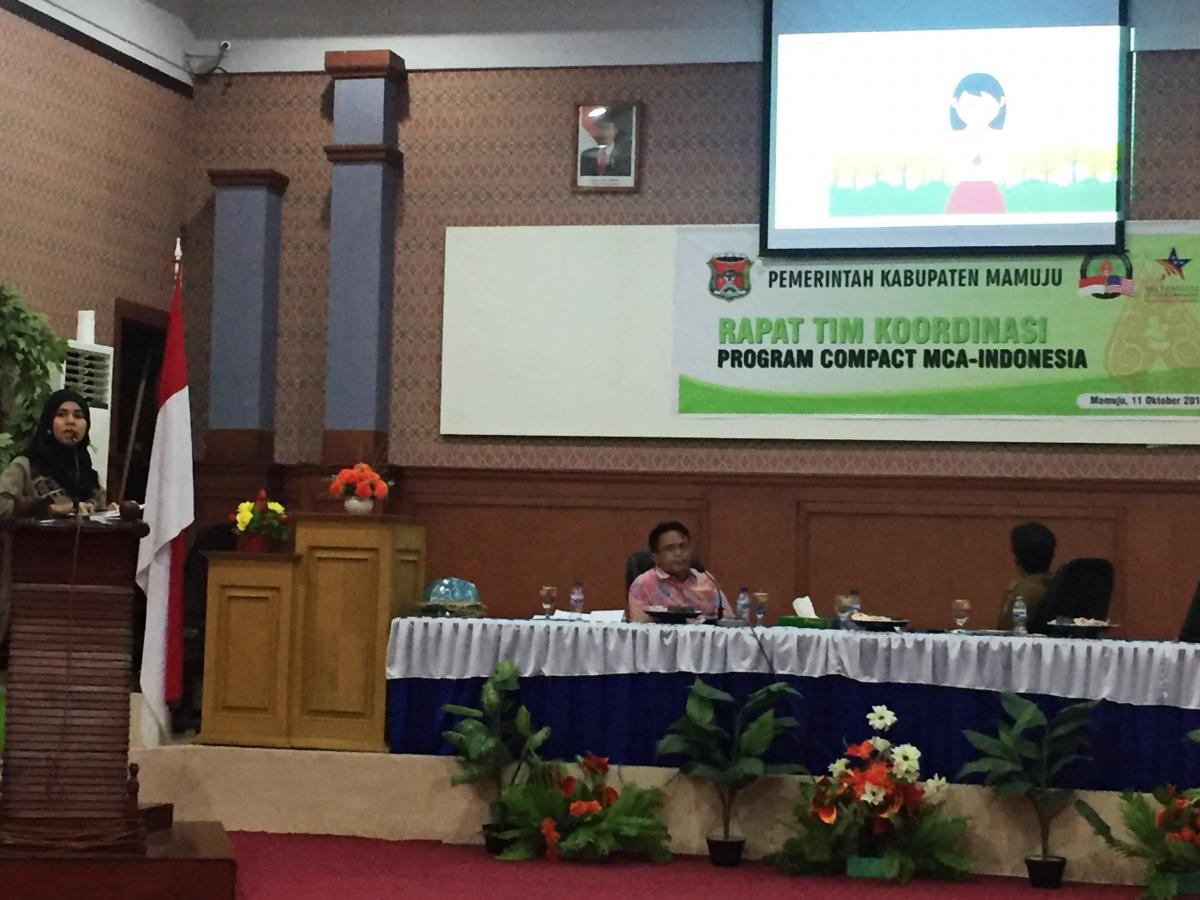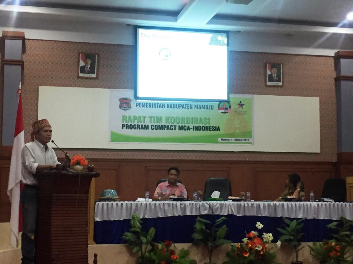 Tanggal 11 Oktober 2016 bertempat di Ruang Pola Bupati Mamuju, telah dilaksanakan Rapat Tim Koordinasi Program Compact MCA-Indonesia Kabupaten Mamuju. Kegiatan ini dimaksudkan sebagai wadah koordinasi lintas sektoral terpadu dan berkesinambungan guna mendukung kegiatan dan kelancaran pelaksanaan Program Compact MCA-Indonesia di Kabupaten Mamuju. Adapun tiga proyek MCA-Indonesia yang diangkat dalam rapat koordinasi kali ini mencakup Proyek Kemakmuran Hijau (Green Prosperity), Proyek Kesehatan dan Gizi Berbasis Masyarakat untuk mengurangi stunting dan Proyek Modernisasi Pengadaan.