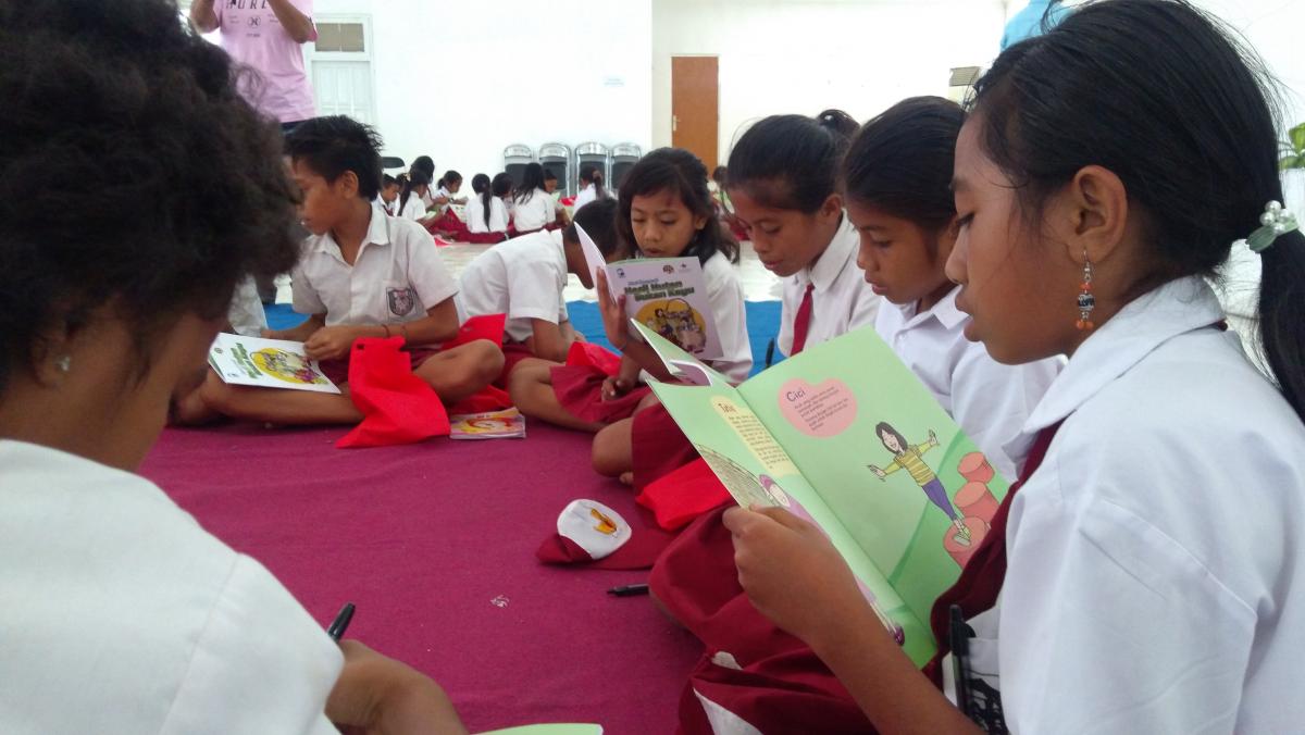 Acara kali ini dipandu oleh Kak Heru, pendongeng asal Makassar sebagai host dan didampingi oleh Ibu Sonya, salah seorang guru SD di Waingapu. Sejak anak-anak datang dan duduk, Kak Heru sudah mengajak mereka melakukan yel-yel dan menyanyi dengan gembira lewat lagu-lagu yang membangkitkan semangat. Salah satunya lagu pramuka yang sudah diganti liriknya.