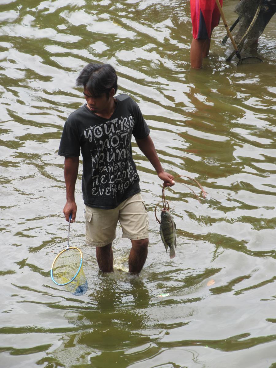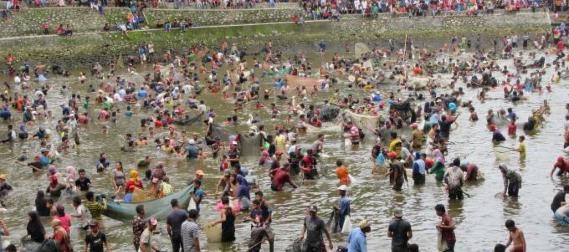Benar saja, belum selesai gema pukulan Gong yang ketiga, puluhan masyarakat mulai turun ke tengah embung membawa alat yang sudah mereka persiapkan sebelumnya. Semakin lama jumlah mereka semakin banyak. Meski pintu air sudah di buka sejah sehari sebelum event berlangsung namun untuk bekerase jumlah air tersebut masih cukup banyak sehingga butuh tenaga ekstra untuk mendapatkan seeokor ikan. Tapi ini justru semakin menarik bagi masyarakat. semakin banyak masyarakat yang turun ke embung suasana semakin meriah. Tidak perlu menggunakan putas atau racun, kepungan manusia yang semakin banyak sudah cukup membuat ikan-ikan itu pingsan. Satu dua orang naik dengan membawa ikan di dalam karung yang sudah mereka siapkan. Penasaran dengan isi karungnya, saya menghampiri salah satu dari mereka dan setelah dibuka, hampir setengah dari karung berukuran sepuluh kilogram terisi ikan dengan ukuran yang cukup besar. jika ditimbang cukup dua ekor saja untuk mendapatkan berat satu kilogram. Saya mencoba menawar dengan harapan bisa membeli ikan hasil bekerase tersebut. Diluar dugaan, ternyata si pemilik ikan menolak, karena ikan hasil bekerase ini adalah berkah dari Sang Pencipta untuk mereka nikmati bersama keluarga. “ ye rezekint elek Sak Kuase, jari anak jarint lek bale” ucapnya seraya mengikat kembali karung lantas meninggalkan saya.