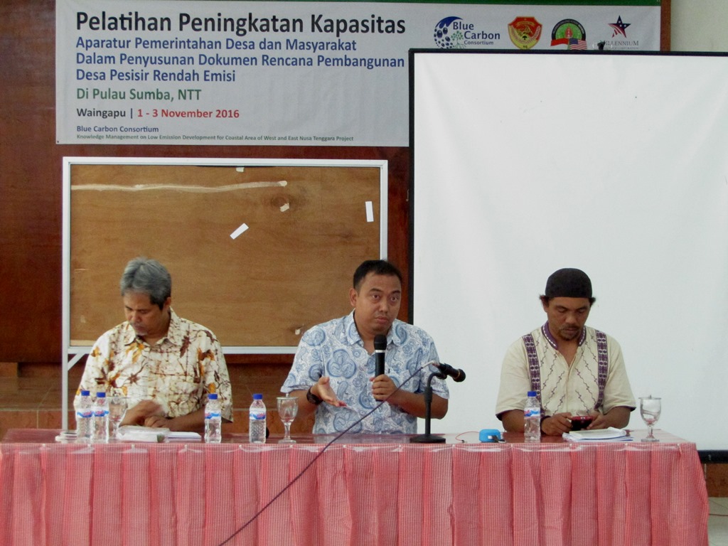 Pada tanggal 1-3 November 2016 bertempat di Aula Hotel Elvin Waingapu – Sumba Timur, sekitar 34 orang peserta yang berasal dari perwakilan aparat desa, masyarakat dan fasilititor desa dari 8 desa pesisir di 4 Kabupaten di Pulau Sumba yang merupakan lokasi intervensi program BCC mendapatkan kesempatan untuk mengikuti kegiatan “Peningkatan Kapasitas Aparatur Pemerintahan Desa dan Masyarakat Dalam Penyusunan Rencana Pembangunan Desa Pesisir Rendah Emisi di Pulau Sumba - Nusa Tenggara Timur”. Suasana pelatihan hari terakhir siang itu berjalan serius sambil sesekali diselingi gelak tawa dari para peserta yang hadir, walaupun cuaca sedikit panas dengan suhu ruangan berada pada posisi 33 derajat celcius. Hari ketiga itu para peserta dibagi dalam dua kelompok besar berdasarkan asal kabupaten yaitu kelompok pertama kabupaten Sumba Timur dan Sumba Tengah serta kelompok kedua kabupaten Sumba Barat dan Sumba Barat Daya, dimana mereka berkesempatan untuk melakukan  review RPJM Desa masing-masing, untuk melihat apakah dokumen yang telah disusun itu telah sesuai dengan Langkah-langkah Penyusunan RPJM Desa yang materinya telah mereka dapatkan sehari sebelumnya. Secara substansi memang tidak ada yang dirubah dari dokumen yang telah dihasilkan desa ini tetapi proses ini memperlihatkan poin-poin apa yang harus diperbaiki untuk penyusunan dokumen RPJM Desa yang akan datang.  Juga proses review ini akan dikerjakan di desa masing-masing sebagai tindak lanjut pelatihan ini.
