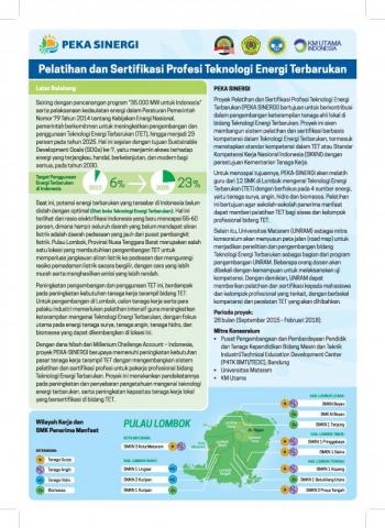 With grant funding from the Millennium Challenge Account – Indonesia, PEKA-SINERGI (Pelatihan dan Sertifikasi Profesi Teknologi Energi Terbarukan – Training and Certification for the Renewable Energy Labor Market) addresses the growing needs of Indonesia’s RET labor market by developing a system of training and certification for RET professionals which meets the present and projected needs of industry.