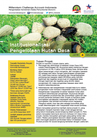 1. Mencegah laju deforestasi di kawasan Hutan Desa (HD) melalui Pelembagaan HD, khususnya dalam kaitannya dengan momentum UU No. 6 tahun 2014 tentang Desa, dimana desa diberi kewenangan untuk mengelola dan mengatur kawasan HD sebagai aset desa. Dengan pelembagaan pengelolaan HD, maka Desa mampu mengelola dan mengintegrasikan pembangunan kawasan dalam RPJMDes yang memiliki legitimasi dan legalitas secara kuat di masyarakat desa. Dengan legitimasi dan legalitas yang dimiliki dalam pengelolaan HD, maka pengelolaan kawasan akan lebih terjamin keberlanjutannya.