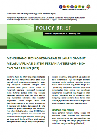 Kebakaran hutan dan lahan yang sangat masif pada tahun 2015 lalu menyadarkan semua pihak untuk mencari solusi terhadap permasalahan ini. Lahan yang mengalami kebakaran sebagian besar merupakan lahan gambut. Terkait dengan ini, Pemerintah Indonesia berinisiatif membentuk Badan Restorasi Gambut (BRG) yang bertugas melakukan pemulihan lahan dan hutan gambut yang rusakakibat kebakaran atau kesalahan pengelolaan. Sampai dengan tahun 2016 diperkirakan sebanyak 6 juta hektar lahan gambut di Indonesia telah terbakar dan sebanyak 2-3 juta hektar lahan gambut rencananya akan direstorasi. Pada tahun 2016, ditargetkan seluas 600.000 hektar lahan gambut di Indonesia akan direstorasi dan Sumatera Selatan menjadi salah satu propinsi yang jadi target untuk direstorasi. Upaya untuk restorasi lahan gambut selain dengan menjadikannya sebagai kawasan konservasi, lahan gambut juga sudah dan dapat dimanfaatkan bagi kepentingan ekonomi. Penerapan teknik budidaya pertanian terpadu melalui sistem budidaya yang dikenal dengan Bio-Cyclo-Farming (BCF) adalah salah satu upaya untuk memanfaatkan lahan gambut bagi kepentingan kesejahteraan masyarakat yang tinggal di lahan tersebut. Penerapan BCF ini diharapkan dapat mengurangi resiko kebakaran lahan karena lahan selalu terjaga dan selalu ada komiditas yang dikelola untuk pendapatan masyarakat sepanjang tahun.
