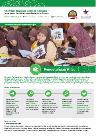 Kegiatan Pengetahuan Hijau bertujuan membangun kapasitas lokal, provinsi, dan nasional guna mendukung strategi pembangunan rendah karbon di Indonesia dalam konteks Proyek Kemakmuran Hijau. Kegiatan ini dijalankan melalui hibah yang bertujuan mendukung usaha-usaha inovatif pengumpulan dan penyebaran pengetahuan yang dapat mendukung strategi pembangunan rendah karbon, serta pengembangan tenaga kerja.