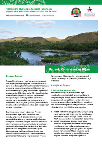 Proyek Kemakmuran Hijau berupaya mengatasi tantangan penting bagi pertumbuhan ekonomi, serta mendukung komitmen Pemerintah Indonesia untuk mengurangi intensitas emisi karbon dan meraih masa depan yang lebih lestari. Tujuan dari proyek senilai 332,5 juta dolar AS ini adalah untuk meningkatkan produktivitas dan mengurangi ketergantungan terhadap bahan bakar fosil dengan cara memperluas penggunaan energi terbarukan dan mengurangi emisi gas rumah kaca melalui perbaikan tata guna lahan dan pengelolaan sumber daya alam.